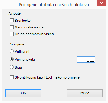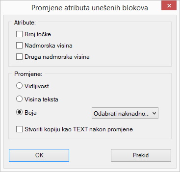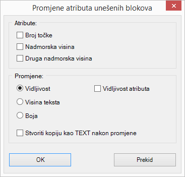 3. Pokrenuti naredbu drugi puta: odjeljku Atributi označiti Nadmorska visina, u odjeljku Promjene odabrati Vidljivost s isključenom kvačicom, te uključiti kvačicu na Stvoriti kopiju atributa kao TEXT nakon promjene